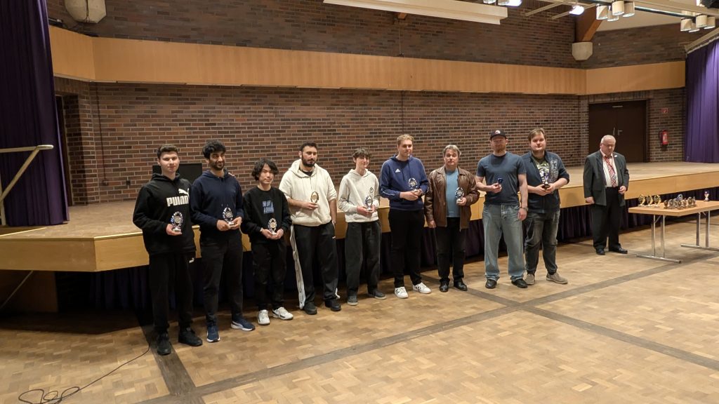 Und es wurde sogar noch besser, denn wir holten nicht nur einen Preis, sondern gleich fünf! Meine 6,5 Punkte reichten für ein Top 8 Finish, während unsere Nachwuchstalente in den Ratingspreiskategorien mächtig abräumten. Lucas gewann den dritten Platz für Spieler unter 1500 TWZ. Ilja konnte sich den zweiten Preis und Oleksandr den dritten Preis in der Kategorie unter 1300 TWZ sichern. Die Friesen haben also wirklich restlos alles abgeräumt.